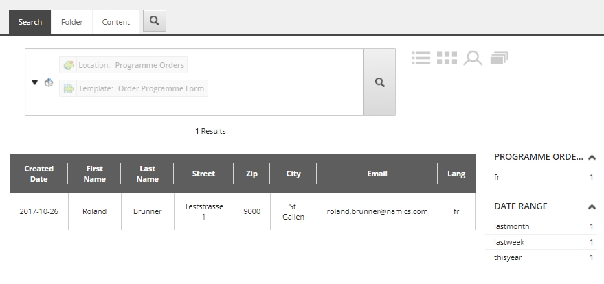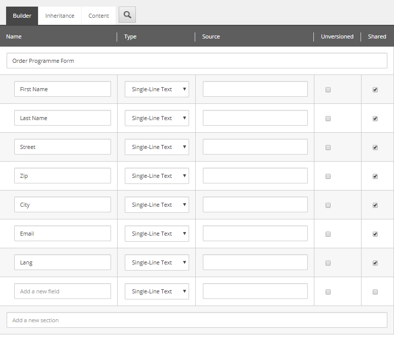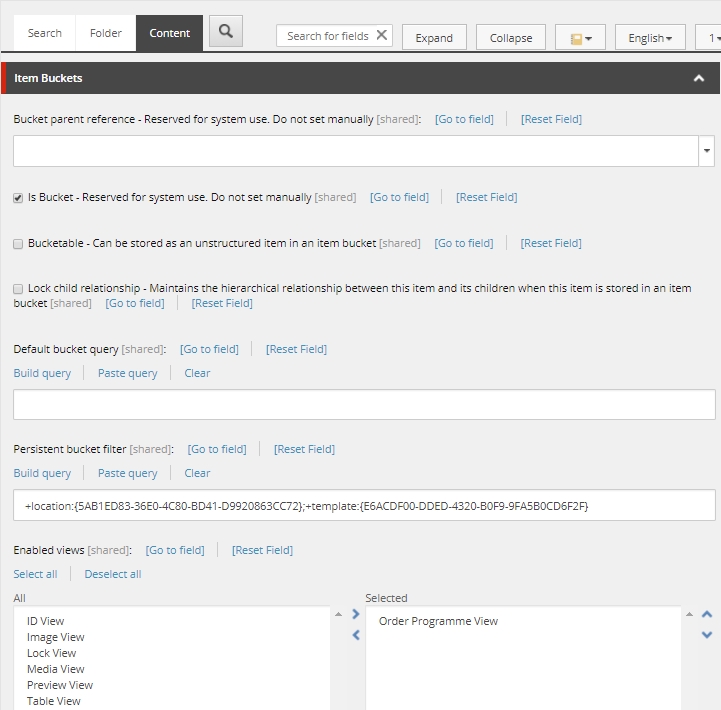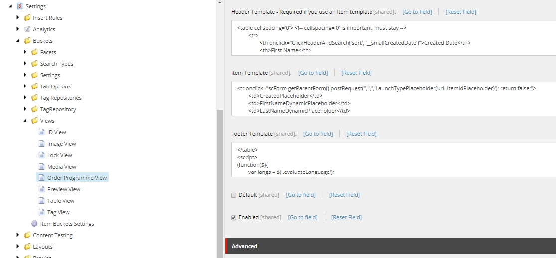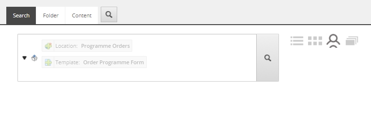 And filter on the template "Order Programme Form", otherwise other item types or folders could be found also. - "Enabled views" is set to the view which we will create later in the next step. It should be set to this view as default.