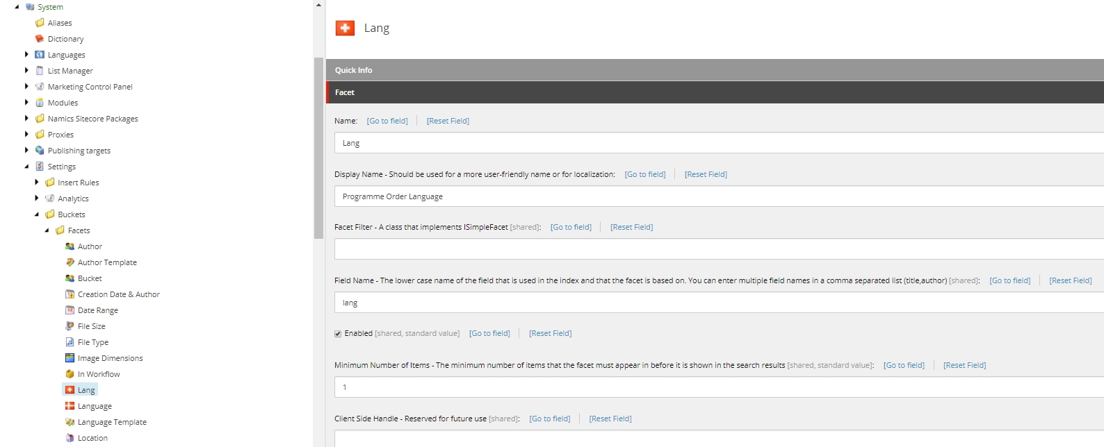 Under System/Settings/Buckets/Facets we create our own Facet: "Lang"