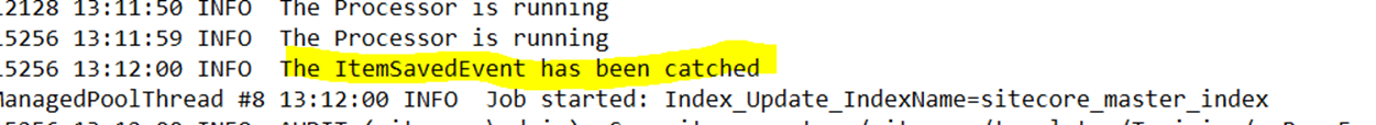 In this block we will try to write something in log file after saving an item. We will catch the event (item:saved) and write the message "The ItemSavedEvent has been catched" in log file. (item:saved) will occures after the item has been saved.