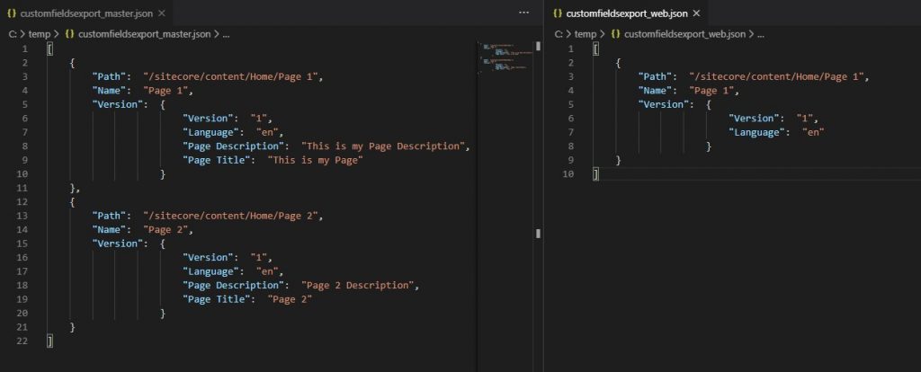 - Afterwards I executed the example "Compare custom data of the project only" and it generates me the json files for the database only with the "path", "version", "language" and my custom projects fields I created!